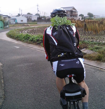 帰りの三原台近くに不審なロード乗りを発見(←の写真)。 頭の先から脚までレーシングジャージで決めていながら、背中に大根を背負って走っていた。泉北方面には時々出没するらしい。この不審なロード乗りから柿とみかんを1個づつおすそ分けして貰ったので、正体までは言及しないが・・・(柿もみかんも美味かった)。 |