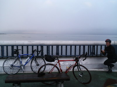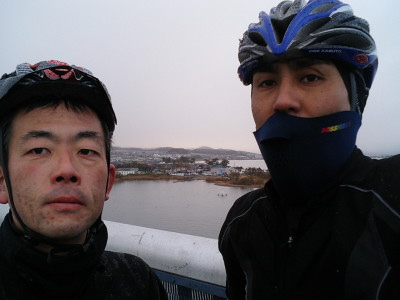 大津到着ではまだ日の出前。みぞれまじりの天気でセッティングしながら、ふと「いったい俺達は何をやっているんやろう・・・」と我にかえる。ブルブル震えながら出発。大津から時計廻りで一周する計画だ。ウェットな路面ながらケロは随分と飛ばす。あっという間に琵琶湖大橋到着。 | |