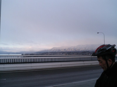 琵琶湖西岸沿いの山が白くなっている。完全に冬景色。 | |