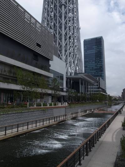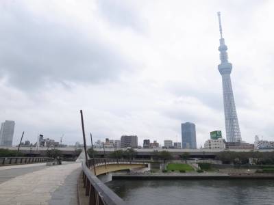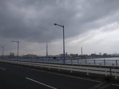 江戸川、荒川と千葉から数えて3番目の川になるのが隅田川。ここを渡るといよいよ都内。 振り返るとスカイツリー。GRD4の広角レンズの影響で、塔が斜めにそびえたって観える。 |