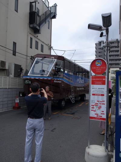 スカイツリーの近くに停まっていた水陸両用バスの「スカイダック」。途中に”スプラッシュポイント”なるものまである。さながら遊園地の急流滑りのよう。 |