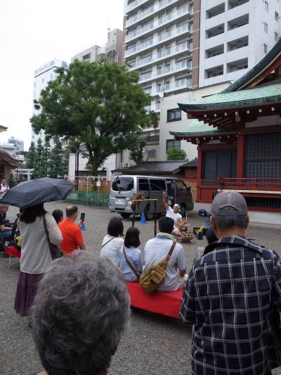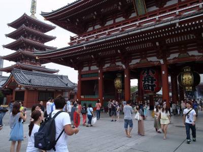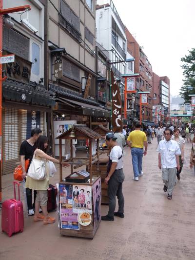 隅田川に渡ってすぐにあるのが浅草寺。本殿横から入ってみると境内で猿回しをやっていた。丁度東京オリンピック決定翌日、観客も外国人が半分くらいで国際色豊か。 ドイツ人の太ったおばちゃん、猿回しのギャグが余程ツボにはまったのかゲラゲラ笑い転げていた。 |