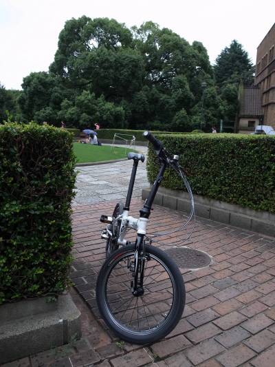 相棒DAHON。充分サドルは上げれるのでポジションは作れるのだけれど、いかんせんタイヤが太すでて走行性はイマイチ。それとTバーはどうしても好きになれない。 今日のような街の中をウロウロするだけならば、この太いタイヤも悪くないけれど・・・。 その点ミミオヤジがもう1台所有しているKHSのF20はかなりの走行性がある。そっちを貸して、と言ったら却下されてしまった。 |