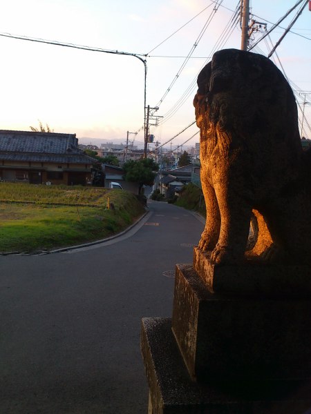 古市・大阪市街道と30kmを2本こなし、息子も休み休み走ればそこそこ距離を走れる事が判った。そこで朝駆けコースの中では一番ハードと思われる泉北緑道朝駆けに誘ったところ、「行く」と即答。担任の先生がこの辺りに住んでいて、「びっくりさせる事ができるわ」との事。目的が小学校3年生らしくて可愛いものだ。出発は6時15分。これまでと違って坂のアップダウンがあるので、ペースはとにかくゆっくり。7時陶荒田神社到着、おにぎり休憩。朝焼けに染まる狛犬。見つめる先は泉北方面。