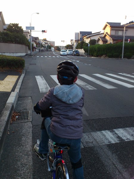 泉北周回道路は道幅が広い割に交通量も少なく、大和川沿いの下町に住んでいる息子には新鮮だったようだ。アップダウンもご機嫌にクリアしていく。が、さすがに庭城台辺りでへばってきて 「休憩場所どこ?」を連発しながら走る。8時過ぎ新檜尾公園到着。さすがにくたびれた様子。