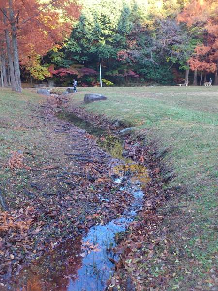 紅葉に染まる公園。いつ来てもここは素晴らしい。こんな小さなせせらぎを真ん中に横切らせるなんて、この公園を設計者はどんな人だったんだろう。敷地が無尽蔵にあれば他にも幾らでもあるのだろうが、ここは駅から徒歩10分も掛からない場所にある。にもかかわらずこの場所に立つと建物がほとんど見えなくて静かだ。少し元気になった息子が、このせせらぎの周りで遊びだした。
