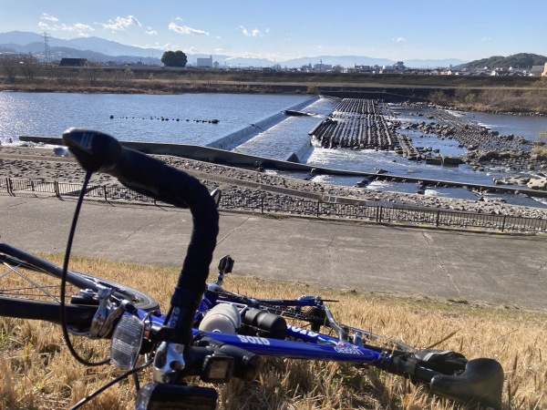 とは言え、実際のところは私の方が限界に近くて、本当は少年達がチラチラ後ろを見なければもっと手前で休みたかった。別れた瞬間にどっと疲れて一休み。魚道が整備されて見晴らし良い。最後のチョコレートを食べて栄養補給。自転車、久しぶりに遠出してしんどいけど楽しいな。