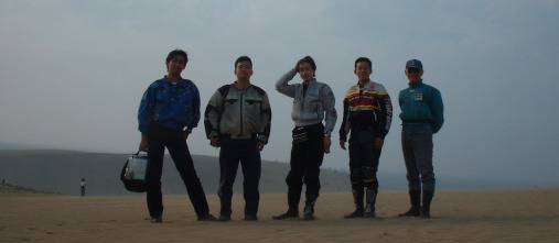 銀だこ氏とはそれまでも福岡時代からRYUBE、ひまわり組双方で既に6〜7年のおつき合いはさせて貰ってはいましたが、RYUBEでは忍者親分と部屋を同じくする重鎮。ひまわりでもそれ程気軽に話をした記憶が無く、今だから告白しますが隊長や子忍者君に混じってひときわ威勢の良い、無謀な幹事があの人だとは想像できていませんでした。その時私は今ほどバイク熱に当てられていた訳ではなかったのですが、無邪気に無謀な計画話で盛り上っているのを観ているうちに自分も参加したい、と思いが強くなり相棒Tの家に地図を借りに行きます。これまたこの話に刺激を受けたTが、誘ってもいないのに面識も無いクラブのツーリングに参加したいと言いだす。そして何度か計画が流れた後のその年の秋、九州から子忍者氏、隊長、銀だこ氏の3名が、大阪からは私とTの2名が、それぞれ鳥取を目指して合流し、鳥取砂丘まで走り、蒜山高原で馬鹿騒ぎの宴を催しました。