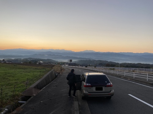 とある金曜日、受験勉強に煮詰まったミミ坊から「明日香に連れて行ってくれ」とリクエスト。大好きなレガシィに乗りたかったようで、30分だけ遠回りして朝焼けを観てから庭に向かいます。
