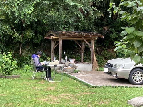 「勉強しています」 「・・・・」.。本人曰く自然の中、お気に入りのレガシィを前にとても集中できた、との事なので良かった。ミミ坊が熱心に勉強している間は、草を抜いたり竹を切ったり。昼前に帰宅しました。