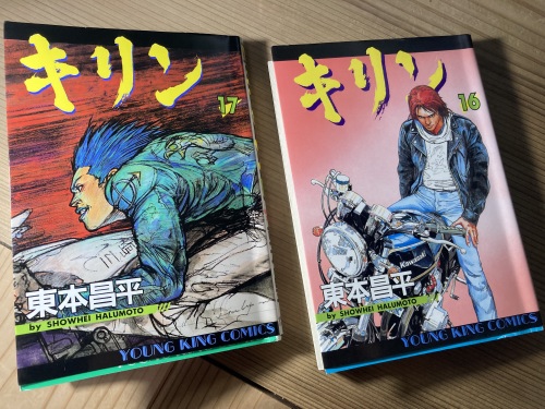 そこで見つけたのがのが漫画「キリン」。言わずとしれたバイク漫画の金字塔。宿泊出張先の漫画喫茶で少しづつ読み続けたのは営業時代でもう15年以上も前。書棚に置いていたのは7巻〜18巻までの第2部、私が一番好きなシリーズでした。少し立ち読み、歯抜けも数冊あるけれどこれは手元に置いておきたい、8冊纏めて大人買いしました。