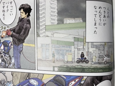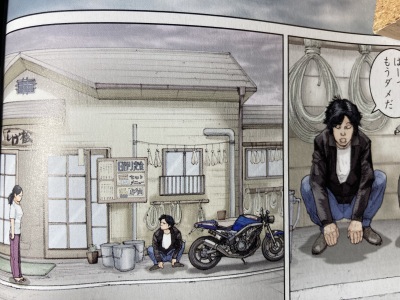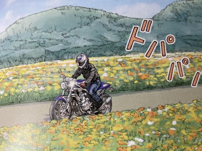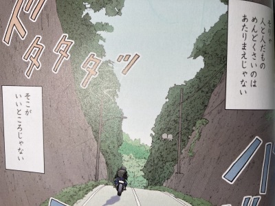 女将に助けられて再びSRXで走り始める主人公。冷え切っていたココロが女将の言葉で再始動します。主人公が辿り着いたのは満開の花畑(トップの場面)。実際の漫画は見開き一面花畑の中をSRX600が進んでいます。この場面がほんと素晴らしい。女将の料理屋に辿り着くまでも、主人公は道中同じような景色を通り過ぎていて、掛けて貰った人の優しさにバイクの鼓動が相まって”観えていなかったものが観えるようになった”のかもしれない。是非漫画を買って観てみて下さい!