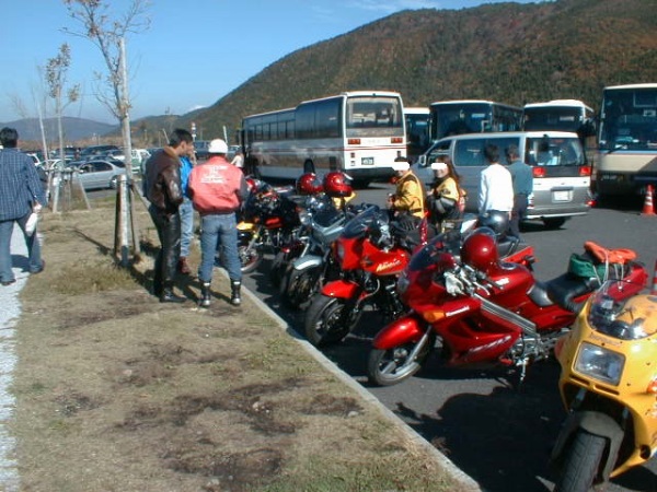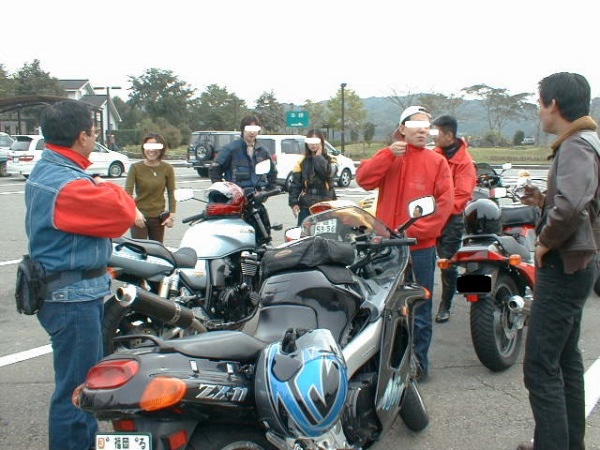パーキングでの休憩時は即席バイク談義。「タイヤはハイグリップがいいよ〜」「すぐ減ったら勿体無くないですか?」「カスタムも楽しいよ」「改造してバランス崩れないですか?」「自分の愛車が乗り易くなったら楽しいでしょ」 「ノーマルが好きだから、今のままでいいです」