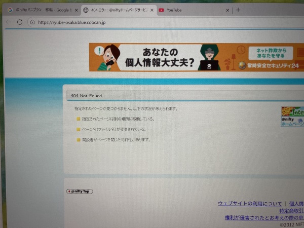 10月1日(水)晩、ブラウザを開けるとタブの一つが”404エラー”になっていました。私が管理している2つのサイトのうちのひとつ「RYUBE大阪」のホームページが何故か表示出来ない状態。すぐに現況確認、@Nifty管理画面を開けると管理画面は表示できるものの、アカウント情報もエラー。更に情報を集めてみると以下の現況になっている事が判りました。