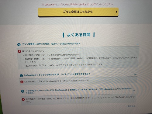 実際のところ、提供されるサーバは常時安定でトラブル皆無。節目節目のサポートは特に充実/懇切丁寧でした。今回終了のミニプランも、昔はどこにてもあったプロバイダー契約に”おまけ”でついてきたホームページサービス終了後、受け皿として長らく無料で提供されてきたものです(そこは今でも感謝しています)。我が家のプロバイダー契約が不要になった時は「基本契約に変更する事で、メールアドレスとホームページを維持できます」と教えてくれたのも当時の@Niftyサポートでした。そんな感じでの30年だったので、今回の事態は只々驚くばかり。