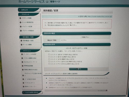 サーバ管理画面には、凍結されたホームページ再開の手続案内と申請フォームが表示されていました。代替プランで最安は12ヶ月