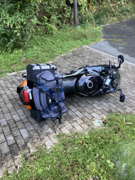 「ミミ坊@マーチに救援依頼するかな〜」と一瞬思ってみたものの、そもそも自分が乗るバイクを起こせなくてどうすんねん。取り敢えずはキルスイッチを入れて燃料コックをオフ。荷物を降ろして身軽にした上で・・・。念の為YouTubeで”バイク、立ちごけ、起こし方”で検索して復習。体を低くして〜、足場を固めて、体全体で押す!・・・燃料等入れたら250kg以上はある車体を起こす事が出来た!良かった。