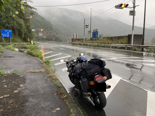翌朝・・・。雨が降り出す前に撤収準備完了させて、いよいよ始動させてみました。セルは弱く、仲間の皆様の御助力を頂いて2回目の押し掛けでなんとか始動。そのまま走り出したものの、ZX-11の反応は弱々しく、国道168号と国道311号の交差点でついにエンジンストップ。