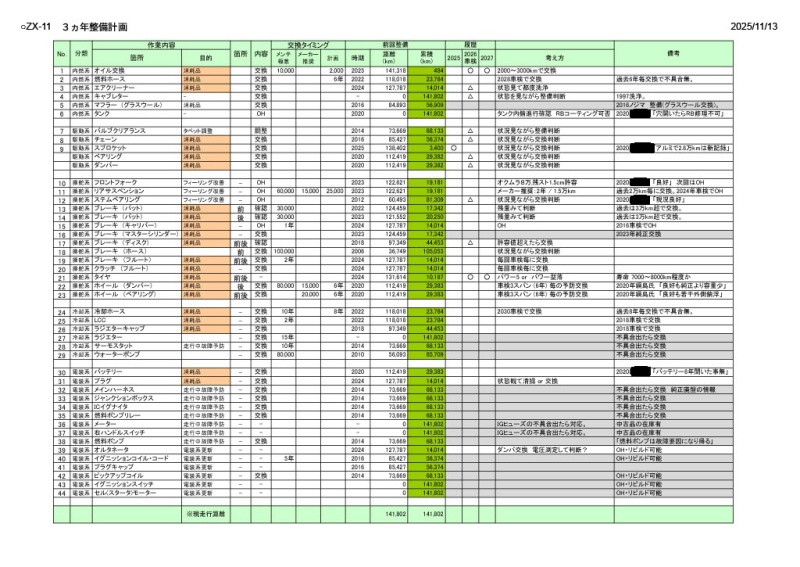 下記はスプレットシートで管理しているZX-11の整備履歴「3ヶ年整備計画」です。オイル交換スパンから、各パーツの交換有無と前回交換からの走行距離を一目で観れるようにしています。1日目夕方T工場長と打合せする段階でこの情報を元に、バッテリーとオルタネータの交換/修理スパンは確認済でした。オルタネータはOHはしていても未交換。耐用年数30年のパーツって、考えてみたらとんでもない耐久性です。