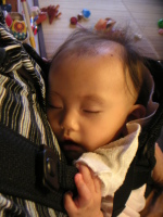 → C目が覚めて再び床で遊ぶ(1時間) → @に戻る ・・・と4時間サイクルのうち1時間程は今でもこうやって吊るしています。心臓の音が聴こえて安心するのでしょうか。おっぱいが足りない時以外はぐずる事はありません。暫く抱っこしていると頭をもたれて眠ってしまいます。