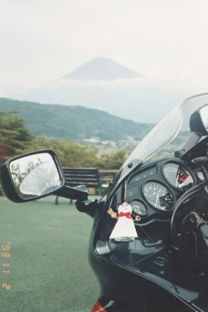 富士山とZZ-R400、そしててるてる坊主の”てる吉”です。 この”てる吉” よく 「いいなあ、彼女に作って貰ったんか?」と冷やかされました。確かに観ての通りの手作りで、私が東京までバイクで行く事を知った友人が作ってくれたものです。どんな友人か?は最後にご紹介するとして、一目見てこのてるてる坊主を気に入り”てる吉”と命名、以後ZZ-R400が私の相棒でいる間ずっと写真の位置に吊るして、日本全国走り回りました。バイクに乗っていると今日のように秋晴れで心身ともに最高の時もあれば、雨や寒さでハンドルを握るのさえ辛い時もあります。そんな時、この”てる吉”の笑顔のピースサインを観て自分を奮い立たせたものです。さて・・・・。