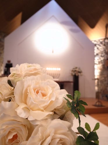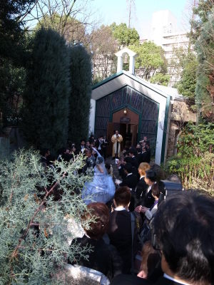 緑いっぱいのチャペル、庭が綺麗で思わず見とれてしまいました。リングボーイは緊張気味、登場後一礼したかと思うと凄い勢いで神父様まで指輪を届け、ちょっと早過ぎたのでは?とも思いましたが無事大役を果たしました。純白のウェディングドレスがとても綺麗な花嫁の I ちゃん。終始リラックスしているのはさすがです。男前の旦那さんと、指輪の交換、結婚の署名を無事済ませチャペルの外に出るとすっかり青空。 I ちゃんの執念だね(笑)!。 |
