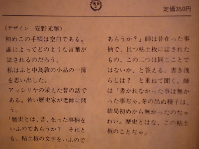 この「文庫手帳」、実は日記として使っています。日記と言っても1日分のスペースは限られていて、5〜6行も書けば埋まってしまいます。他人に見せるものでは無いので字は殴り書き、昔は色々書いていましたが今はその日あった事を羅列するだけです。1988年初版が発刊された時からスタートしていますので今年で27冊、気が付けば四半世紀になりました。最初の1冊・1ページ目は高校受験真っ只中、中学3年の正月です。”受験まで残りを3ヶ月を頑張って合格し、思う存分ゲームをする”と抱負が書かれています。その抱負通り首尾良く高校に合格したは良いが、春休みからゲーム三昧の挙げ句アホになったんやで。」と27年前の自分に言ってやりたい・・・年始の目標設定は大切ですね。さて、その初版の裏表紙にはこんなコメントが書かれています。