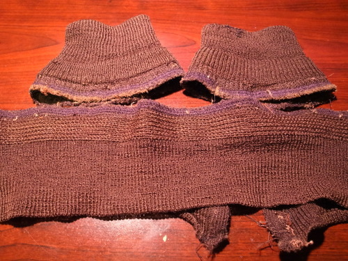 元のリブ。虫食いやほつれでボロボロ。2年前の東京出張時に一気に劣化して、夜な夜な独身寮の狭い部屋で、慣れないヘタクソな裁縫で応急処置したのが懐かしい。穴は広がりは食い止めましたが、素材感もゴアゴアしてきてさすがに限界。