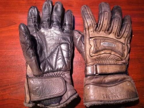 満18歳のG-1の更に先輩をいく、ゴールドウィン製グローブ。学生時代20歳でZZ-R400に乗り始めた時から使っているので満22歳。元々黒だった色が落ちて一層良い味が出てきました。この時代のゴールドウィンのトップモデルでゴアテックスのシートが生地裏に使われています。ほつれもほとんど無く、あの時代の製品の品質の高さが良く判ります。