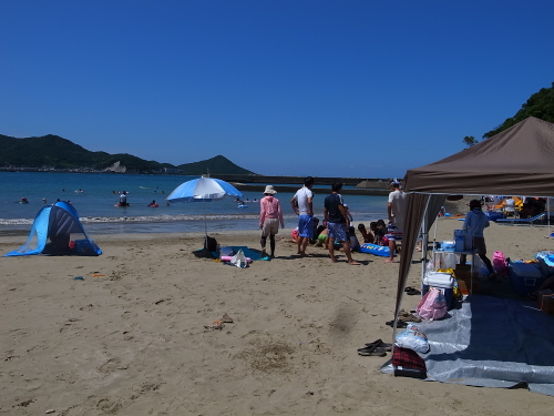 二日目は最初から海に行きます。産湯海岸に9時半到着。初めて訪れましたが福岡の芥屋海岸のような非常に綺麗な海岸。近畿にもこんなビーチがあったんだ。私これでも海の男(今は休止していますが)。水着とTシャツの下に久しぶりのウェットスーツを着込んで、子供達と遊びます。