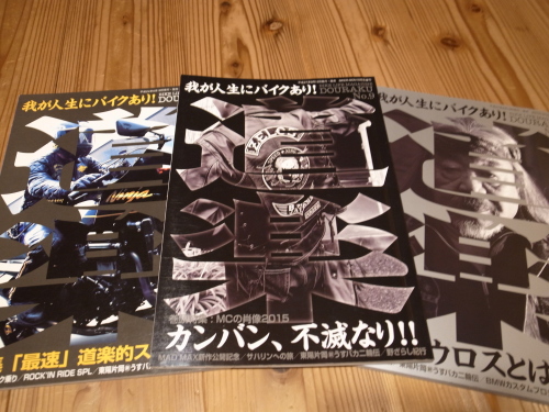 半年程前、駅中の本屋で1冊の雑誌が目に留まりました。「道楽」という見慣れない雑誌。表紙には”我が人生にバイクあり!” ”MCの肖像2015” と続き、刺繍でチームロゴが縫いこまれた革ジャンの写真。 極めつけは 「カンバン、不滅なり!!」。 ページをペラペラとめくると、漫画「キリン」に出てくるキャラクターそのままコスプレ(?)したオッサン達とクラブチームのオンパレード。・・・うわ〜、なんてコッテコテな雑誌!第一印象はドン引き、静かに元の棚に戻しました。