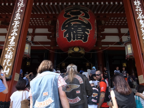 浅草寺をお参りするキリンから飛び出したような不良(?)外人モーターサイクルクラブの連中。