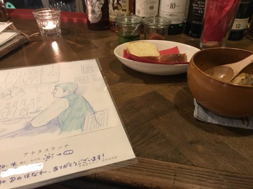 「アナタスケッチ」、私も1枚描いて貰いました。 あまり似ていない(笑)。スケッチは似顔絵と違って似せる必要はないのだそうです。「お店の雰囲気を楽しんでいる姿をスケッチにして下さい」とリクエスト通りに、背景はうまく動かして良い雰囲気のスケッチになりました。