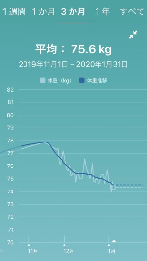 自転車ダイエットを始めた11月から、順調に体重が減っています。リバウンドがある時は、自宅で食べ過ぎた週末明けか飲み会明け。ギザギザ刻みながらも青いグラフは下降していてこれが励みになっています。第一目標の74kgまであと一歩。
