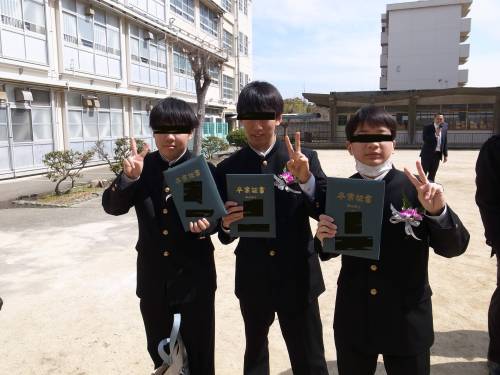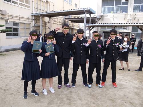 親の花道で中庭に移動した卒業生。皆でワイワイと記念撮影をしたり談笑したり。トップの写真は3年前少年野球チームの同期6名。ミミ坊と中学野球部を共にしたのは2名。お調子者のT君は忘れられない数々のエピソードを残してくれましたが、春の大会での快進撃は突然の彼の覚醒があったからこそ(期間限定だったのもT君らしい)。R君は小学校5年生同じタイミングで野球を始めて、親子ともどもお世話になりました。御両親の都合で県外引越はちょっと寂しい。Y君は硬式チームで頑張って、4月からは愛知県の強豪校に野球留学。Sちゃんは陸上と女子野球の掛け持ちだったが、抜群のセンスで大阪府下超強豪の女子野球部に進学。Iちゃんは唯一中学校から別のスポーツに取り組んだとの事。