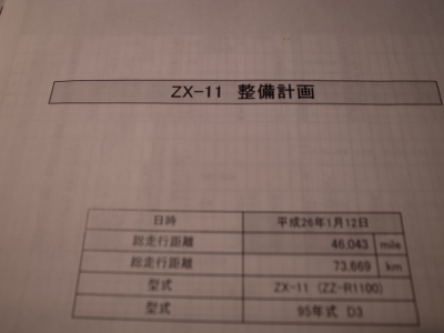冬休みの宿題で、過去の整備履歴をエクセルでまとめて分類しました。幸い赤男爵店の整備依頼票(整備記録)はZZ-R400時代からすべてファイリングしていましたので、ほぼ正確に辿る事ができます(途中何度か赤男爵店以外にも整備を出した事があり、その時の記録は不完全ではあるが)。1行毎に整備内容を記録し、それを各分野毎(内燃系・冷却系・・・)にソートします。最後に整備した時期・現距離とのスパンを一目で見れるようにしました。これで整備内容の把握と、消耗品交換を時期と距離で管理できる下地ができました。