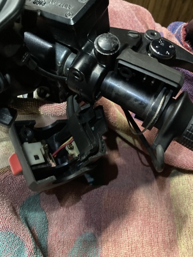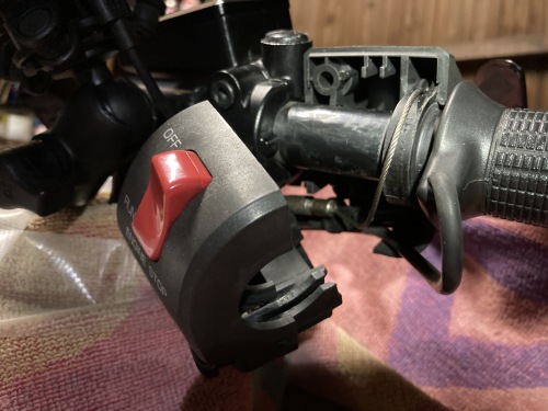 1回中古パーツで予行演習をしているのが、車体付属だとブレーキレバーが干渉。こちらもネジを緩めて角度をずらす。カバーを外したところで想定外のアクセルワイヤーが出てきて焦る。右スイッチボックスがアクセルワイヤーのセッティングルートになっているとは。これが最後に尾を引く事になる。