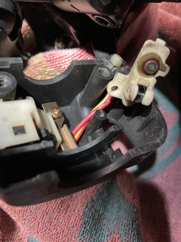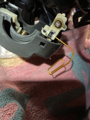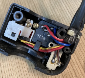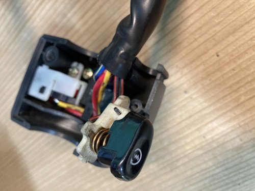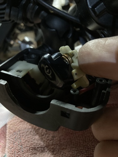 取り敢えずスイッチボックス内部へのアクセスまで出来た。ZX-11がヘッドライトスイッチが無い為、中の配線は中古パーツよりもシンプル。これだったらタイラップを切って配線を逃がす必要もなさそうだ。右写真、うまくスイッチ部まで辿り着く事が出来た。