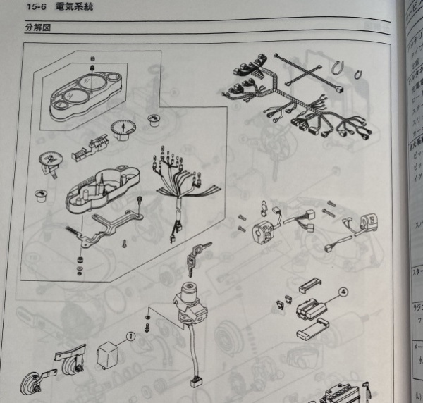 サービスマニュアルの抜粋。右ハンドルスイッチは確かにAssyパーツのようになっている。ちなみにこのサービスマニュアルも15年前に一緒に頂いたもの。