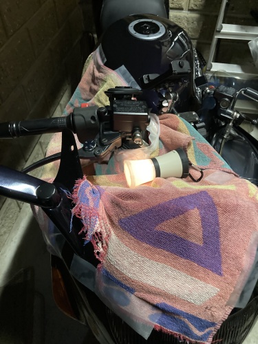 この時点で22時。ガレージは薄暗いのでキャンプ用ヘッドライト等を出してきて作業に備える。スクリーンは取外し、パーツが落ちて行方不明にならないようにウエスで養生。