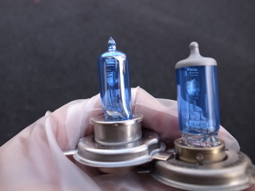 (左は新品の”M&H B2ホワイトステルス、右が交換前Loの切れたバルブ)
