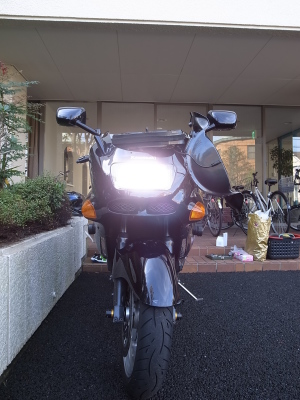 装着した状態でエンジンを掛けて点灯試験。無事ライト点灯! |