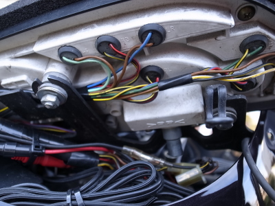 メーター裏側。警告ランプには当たり前だがそれぞれケーブルが繋がっている。今回作業でスピードメーターケーブルは外したが、この辺りの配線類はそのままにしておいた。断線すると面倒なので、今回作業と同様にメーターは仮養生して保持しておいた方が良さそうだ。 |