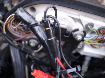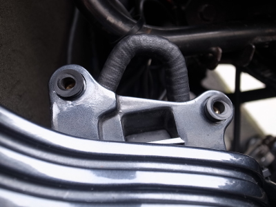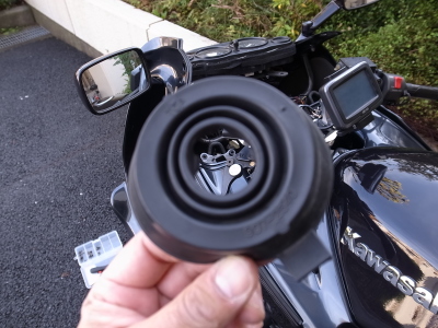 メーター取付ボルトの台座。このゴムワッシャーは油断するとポロッと落ちてしまう。メーター取り付けの際に片側がポロッと転げ落ちてヒヤッとした。ここはビニルテープで養生しておいた方がよさそう。 |