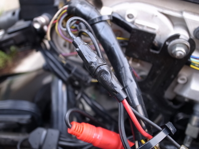 新しいヒューズに入れ替えて、念の為ヒューズ部をビニルテープで固定する。 |