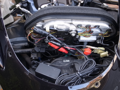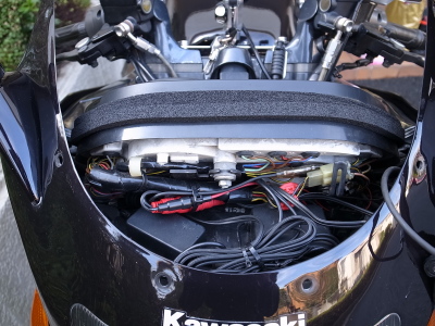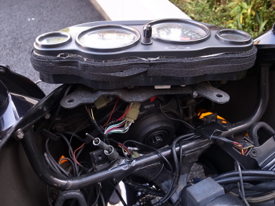 メーター自体にはその他諸々の配線が接続されている。ここを外して復旧しなかったらえらい事なので、メーターをアッパーカウルに仮置きして、作業スペースを確保。 |