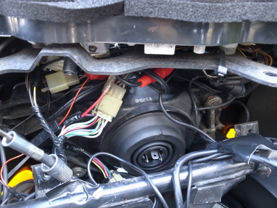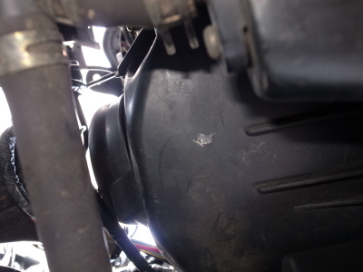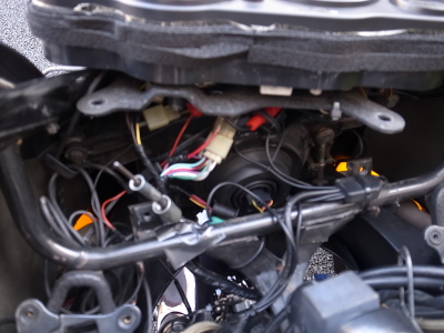 カウル真下からデジカメを差し入れて上部に向けて撮影してみた。なる程原理が判っていたらT工場長の言うように手探りでもカプラーを抜いて作業はできそうだ。 |