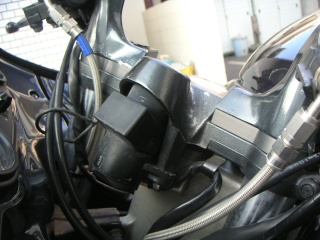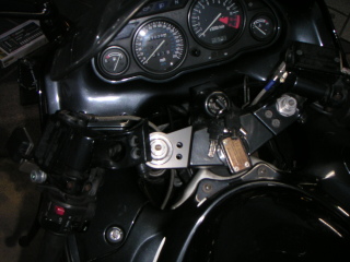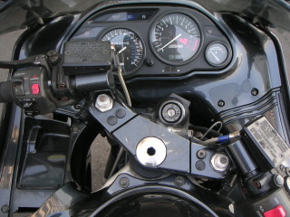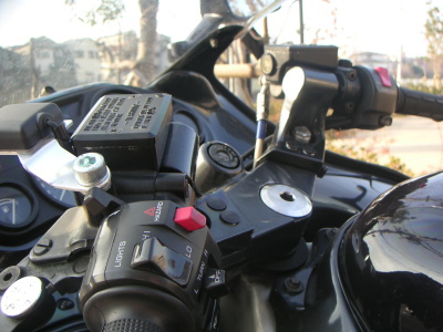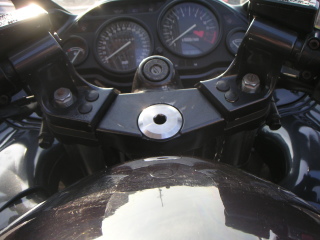 ハンドルアップスペーサーを装着後。 純正と比較しても全然格好悪くはならずホッとした。 取り付けの安定性も全く問題無く、グラグラする事も皆無。 但し、フロントフォークのイニシャル調整が少しやりづらくなったように思う(といってもここをいじったのはハンドルアップスペーサーを装着したその日が初めてだったのだが・・・)。装着時間はたったの10分。ボルト4本の脱着でDIY作業と言えるのか!?と突っ込まれそうだが、機械音痴の私にとってはそれでも無事装着できた事は素直に嬉しかった。 ラインの干渉等は心配していなかったのだが、ETCのアンテナ配線が結構ギリギリだった。 |
