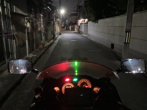 エンジンキーをオフにした状態。iphoneのカメラが優秀なので、写真では明るく観えるが跨った視界は暗くて走れる状態ではない。