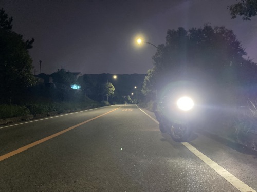 10月12日の高野山朝駆けで、半年間使ってみた現況を改めて確かめてみた。明け方4時半出発。日の出は6時なのでまだ真っ暗、星空が広がっている。幹線道路に抜ける手前でライトの照らし具合を確かめてみた。